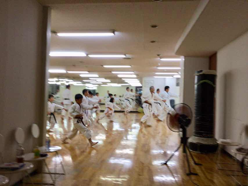 さて今回6/21(金)の審査は見応えがありました。初参加の大人が2人。黒帯に挑戦するための資格「1級」を目指す人が3人。ビトゥイーンに沢山いて、まず審査前に全員で移動の稽古。写真はその様子です。気合も力も入っています。